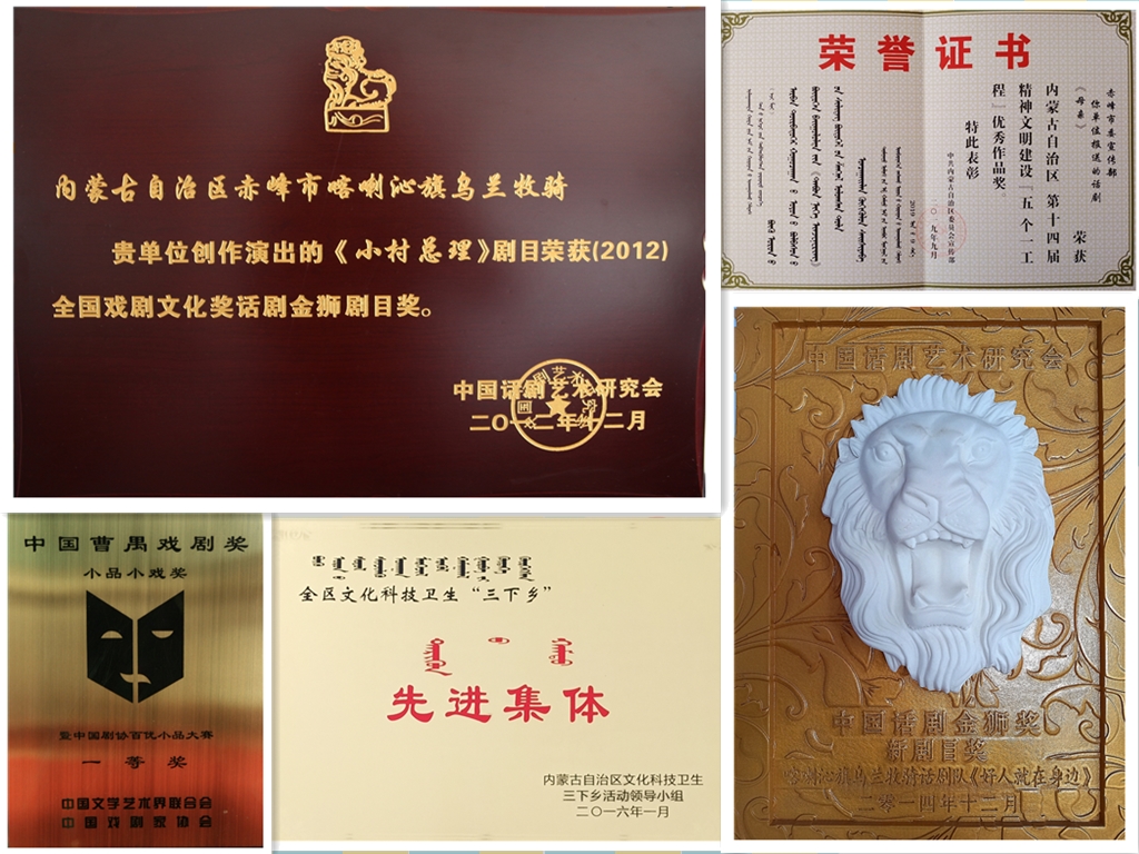 小品《扶贫》获“中国曹禺戏剧奖”小品小戏评选剧目一等奖,原创话剧《我的爸爸戴成钧》《小村总理》《好人就在身边》《母亲》《信念》《不能倒下》的相继创作完成并在全市、全区巡演,先后获得全国戏剧文化奖话剧金狮奖剧目奖、编剧奖、表演奖、草原文化节优秀剧目奖、编剧奖、内蒙古精神文明建设“五个一工程”优秀作品奖、萨日纳奖等一系列奖项,实现了国家、自治区和市级奖励的全覆盖。